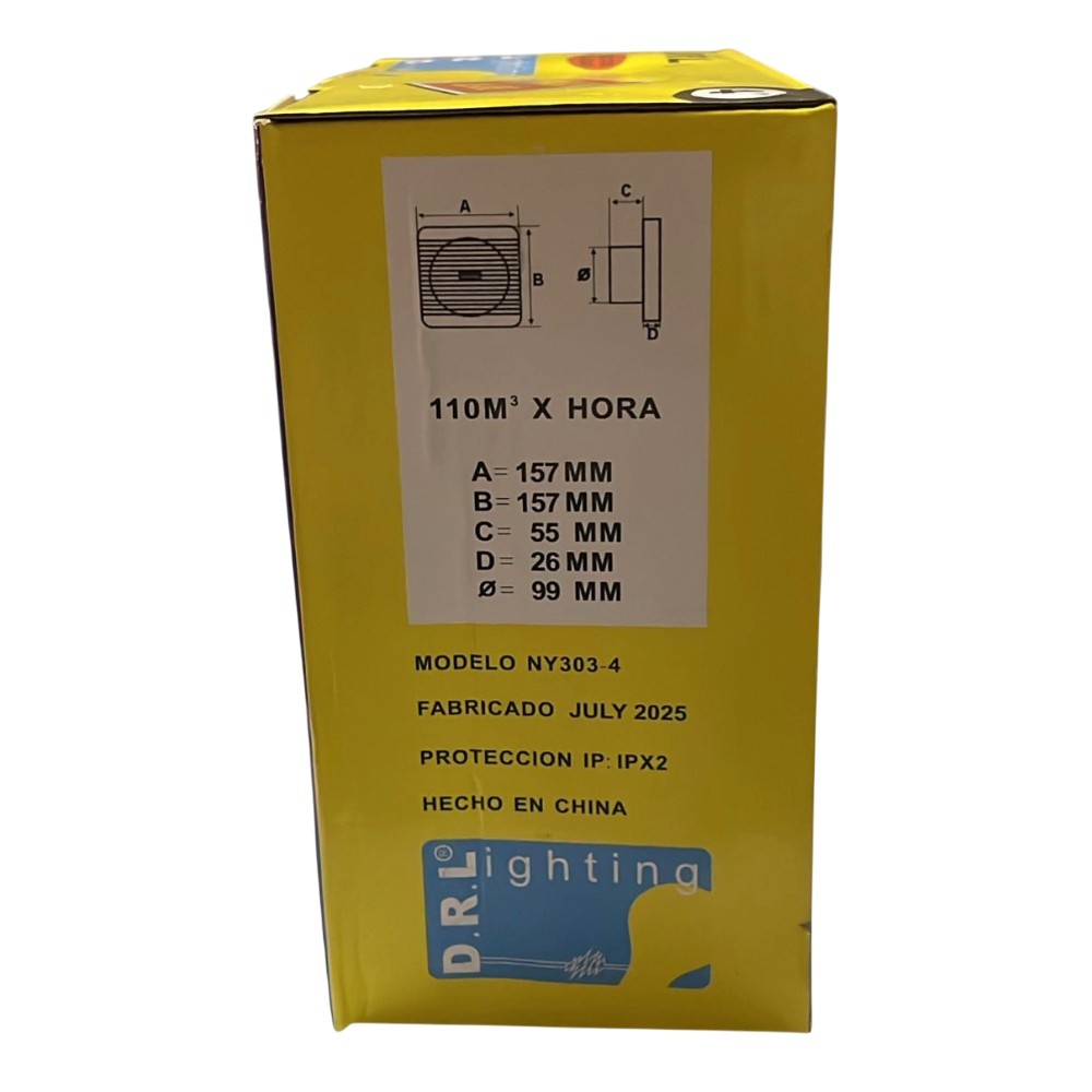 Extractor de Aire 4" Cuadrado DRL Montaje Con argolla de presión en perforación Uso Interior Color: Blanco Factor de Potencia: 21 Kw Modelo: NY303-4 Protección: IP: IPX2 110 M3 x Hora Medida: 157mmx157 mm Diámetro del Ducto: 99 mm